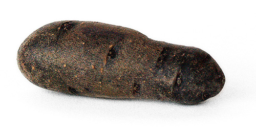 Purple PeruvianPurple through and through, medium to large tubers with many eyes. A true Peruvian variety that produces well in this northern hemisphere. A great conversation piece and a sure fired market potato. Mealiest of the fingerlings, delicious when fried. Late variety. |